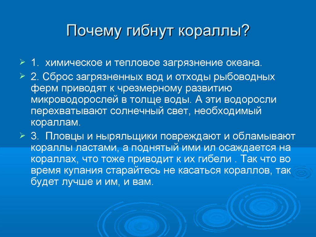 Почему гибнут кораллы?1. химическое и тепловое загрязнение океана.