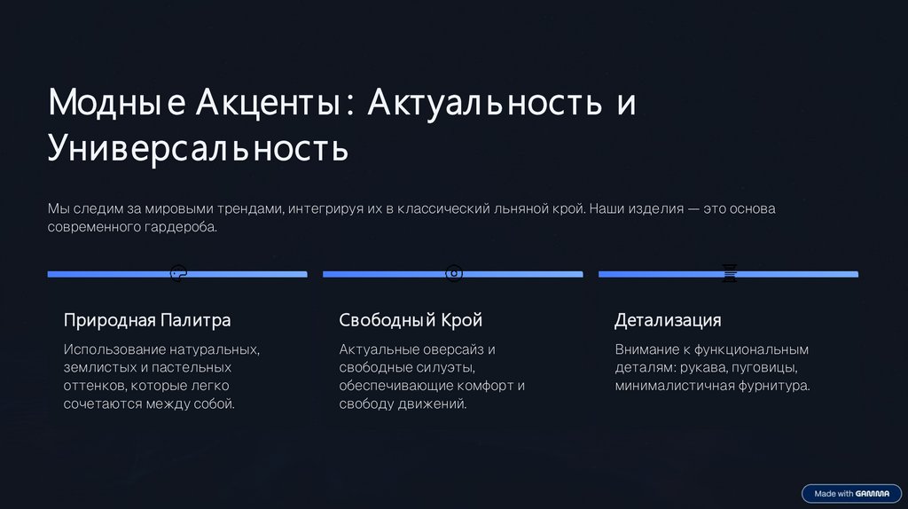 Мы следим за мировыми трендами, интегрируя их в классический льняной крой. Наши изделия — это основа