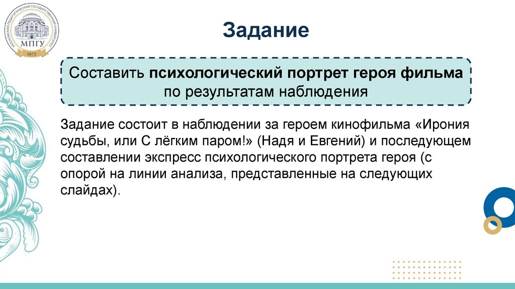 Задание состоит в наблюдении за героем кинофильма «Ирония
