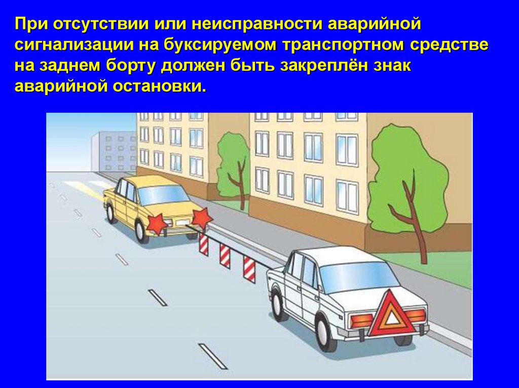 При отсутствии или неисправности аварийнойсигнализации на буксируемом транспортном средстве