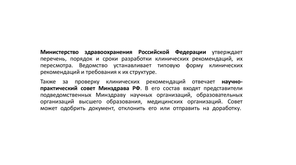 Также за проверку клинических рекомендаций отвечает научнопрактический совет Минздрава РФ. В его состав входят представители