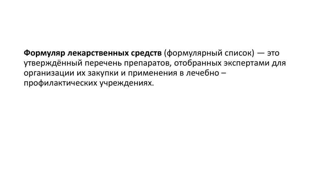 Формуляр лекарственных средств (формулярный список) — этоутверждённый перечень препаратов, отобранных экспертами для