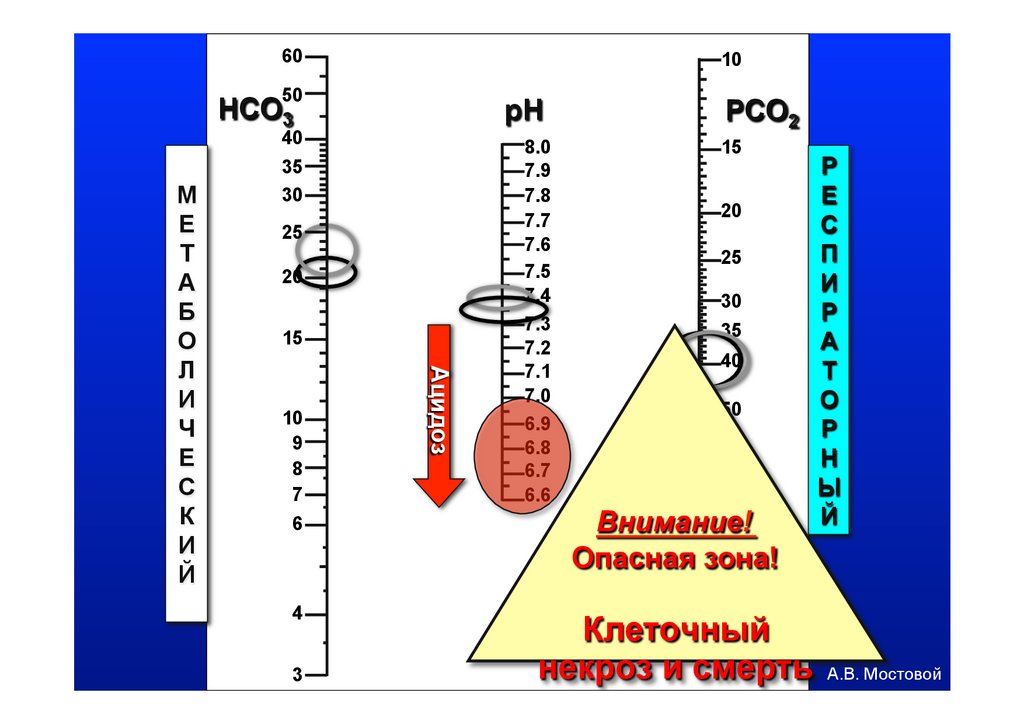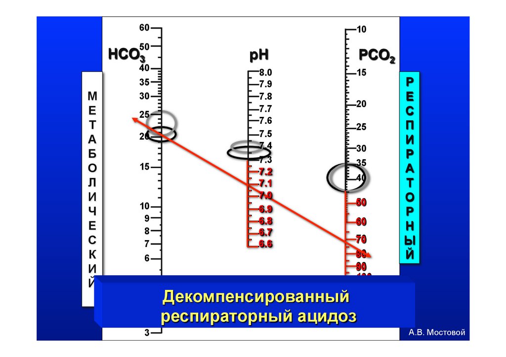 • ↑ PCO2 (гиперкарбия) приведет к ↓ pH