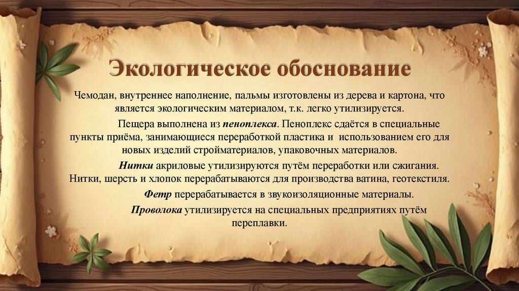 Экологическое обоснованиеЧемодан, внутреннее наполнение, пальмы изготовлены из дерева и картона, что