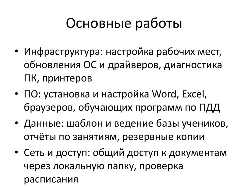 Основные работы• Инфраструктура: настройка рабочих мест,