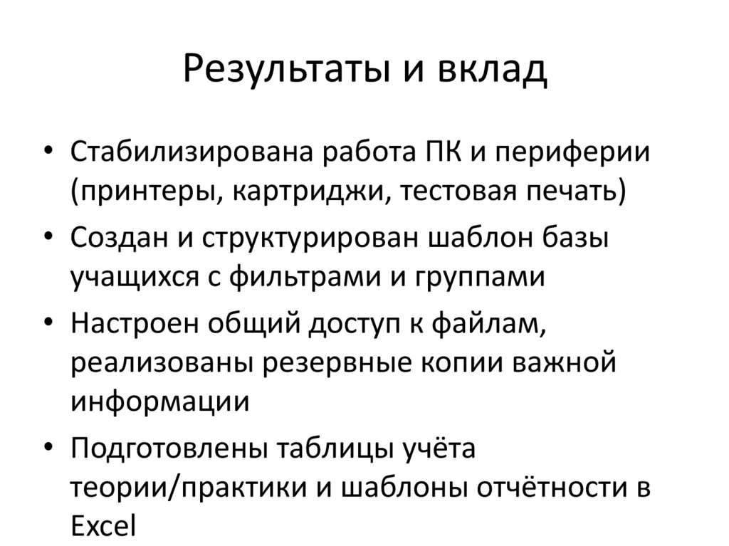 Результаты и вклад• Стабилизирована работа ПК и периферии