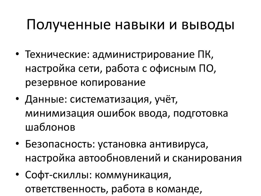 Полученные навыки и выводы• Технические: администрирование ПК,