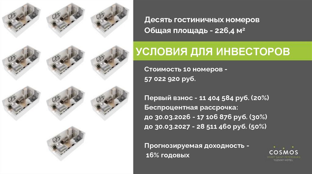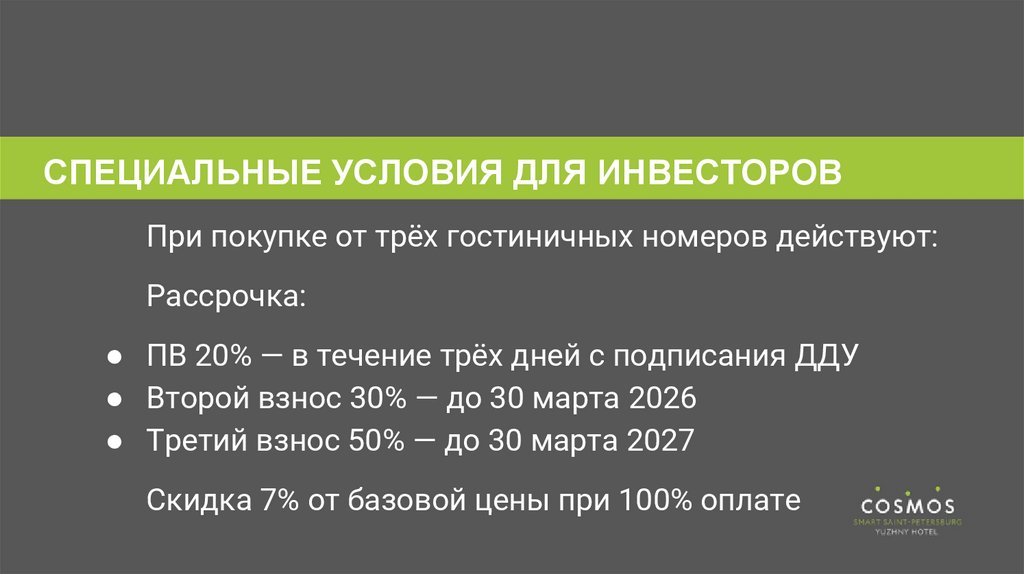 СПЕЦИАЛЬНЫЕ УСЛОВИЯ ДЛЯ ИНВЕСТОРОВПри покупке от трёх гостиничных номеров действуют: