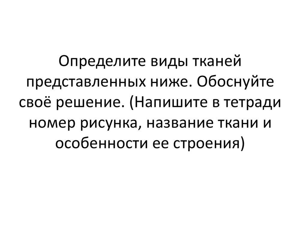 Определите виды тканей представленных ниже. Обоснуйте своё решение. (Напишите в тетради номер рисунка, название ткани и
