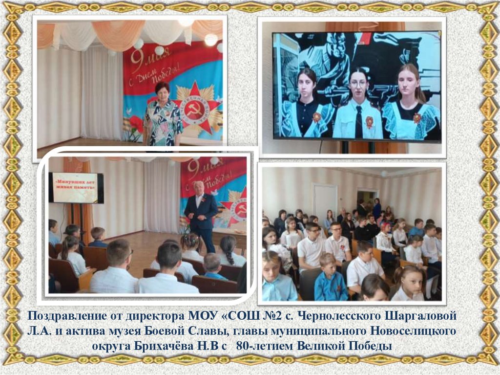 Поздравление от директора МОУ «СОШ №2 с. Чернолесского ШаргаловойЛ.А. и актива музея Боевой Славы, главы муниципального Новоселицкого