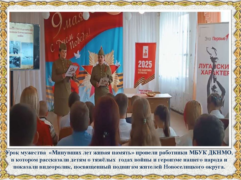 Урок мужества «Минувших лет живая память» провели работники МБУК ДКНМО,в котором рассказали детям о тяжёлых годах войны и героизме нашего народа и