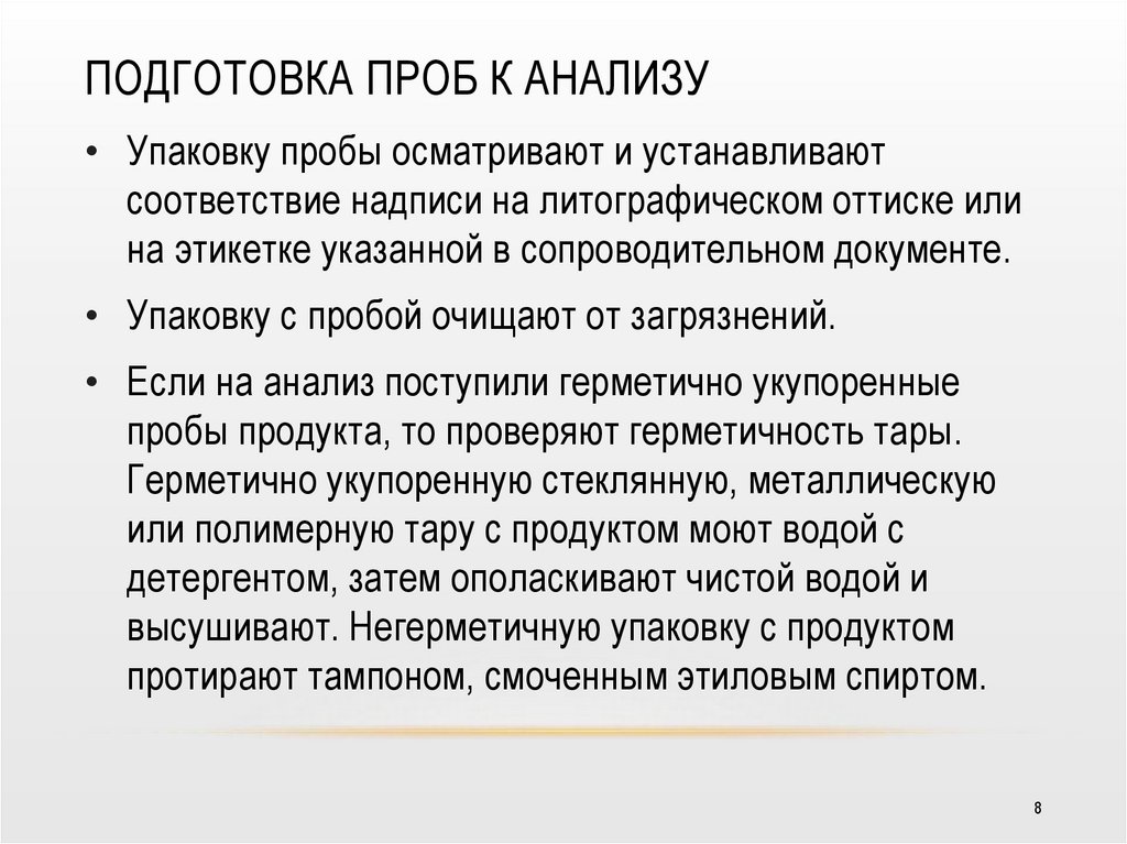 ПОДГОТОВКА ПРОБ К АНАЛИЗУ• Упаковку пробы осматривают и устанавливают