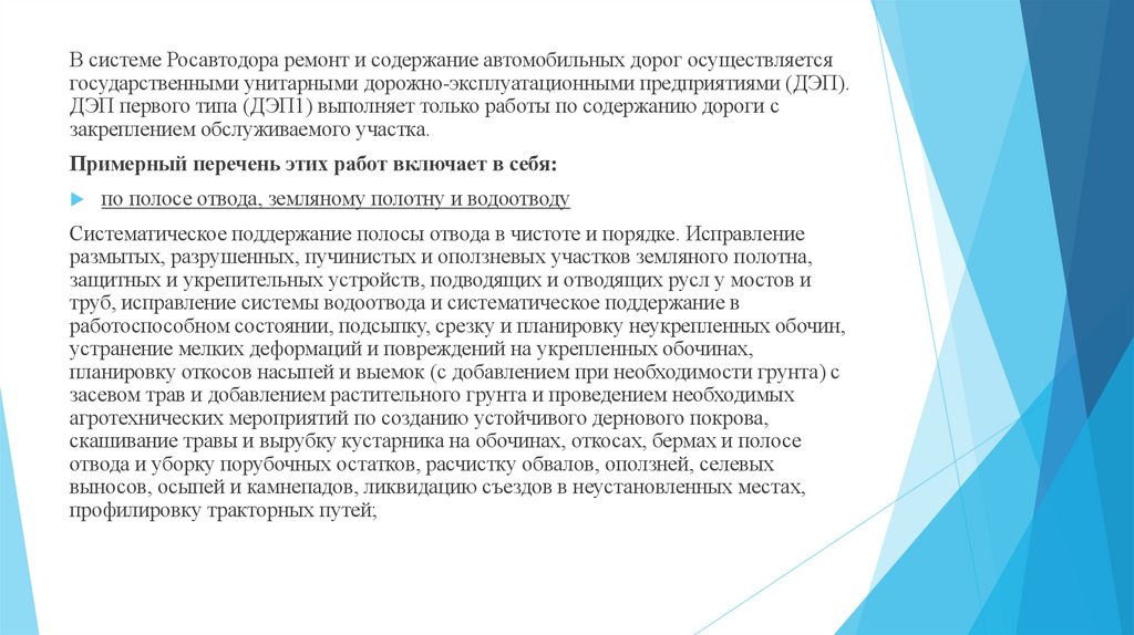 В системе Росавтодора ремонт и содержание автомобильных дорог осуществляетсягосударственными унитарными дорожно-эксплуатационными предприятиями (ДЭП).