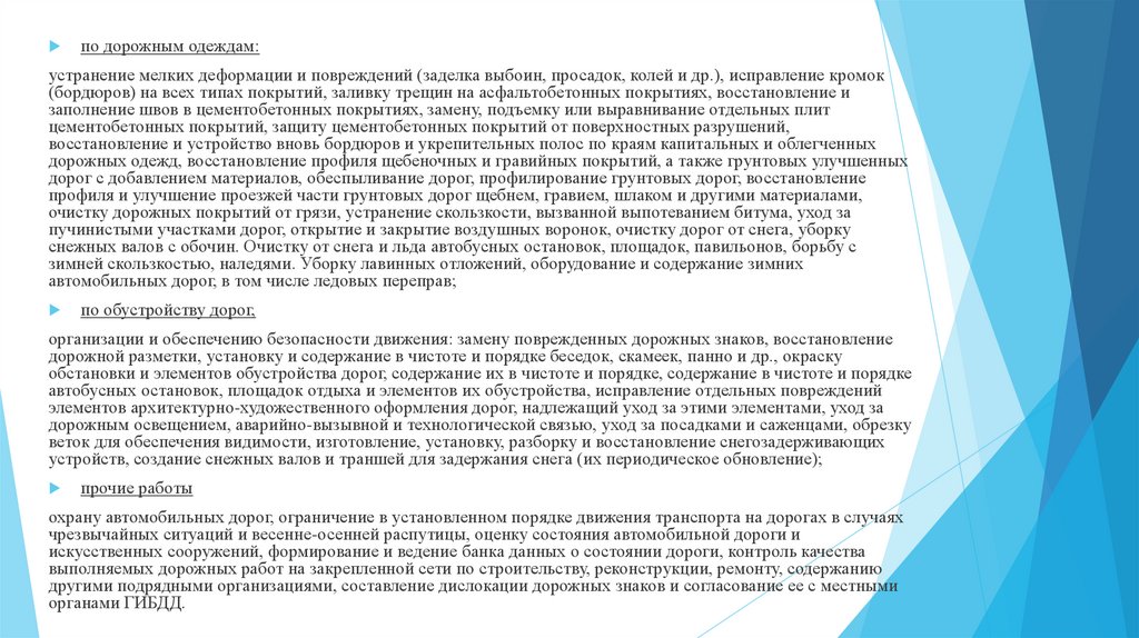 по дорожным одеждам:устранение мелких деформации и повреждений (заделка выбоин, просадок, колей и др.), исправление кромок