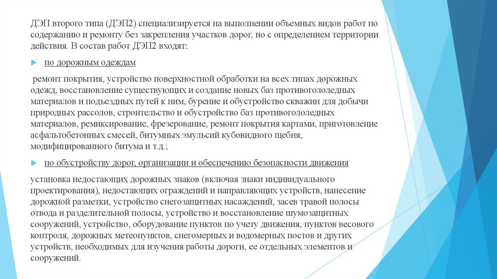 ДЭП второго типа (ДЭП2) специализируется на выполнении объемных видов работ посодержанию и ремонту без закрепления участков дорог, но с определением территории