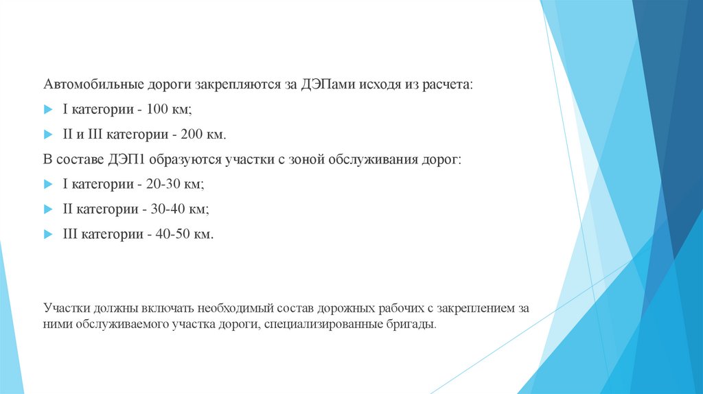 Автомобильные дороги закрепляются за ДЭПами исходя из расчета:I категории - 100 км;