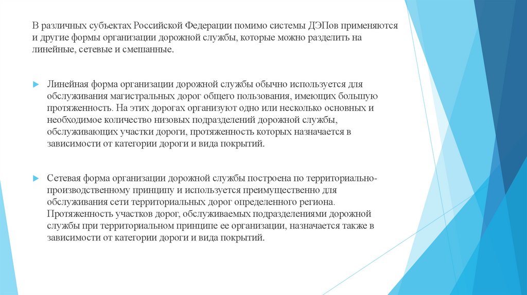 В различных субъектах Российской Федерации помимо системы ДЭПов применяютсяи другие формы организации дорожной службы, которые можно разделить на