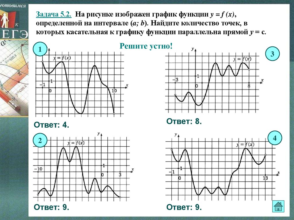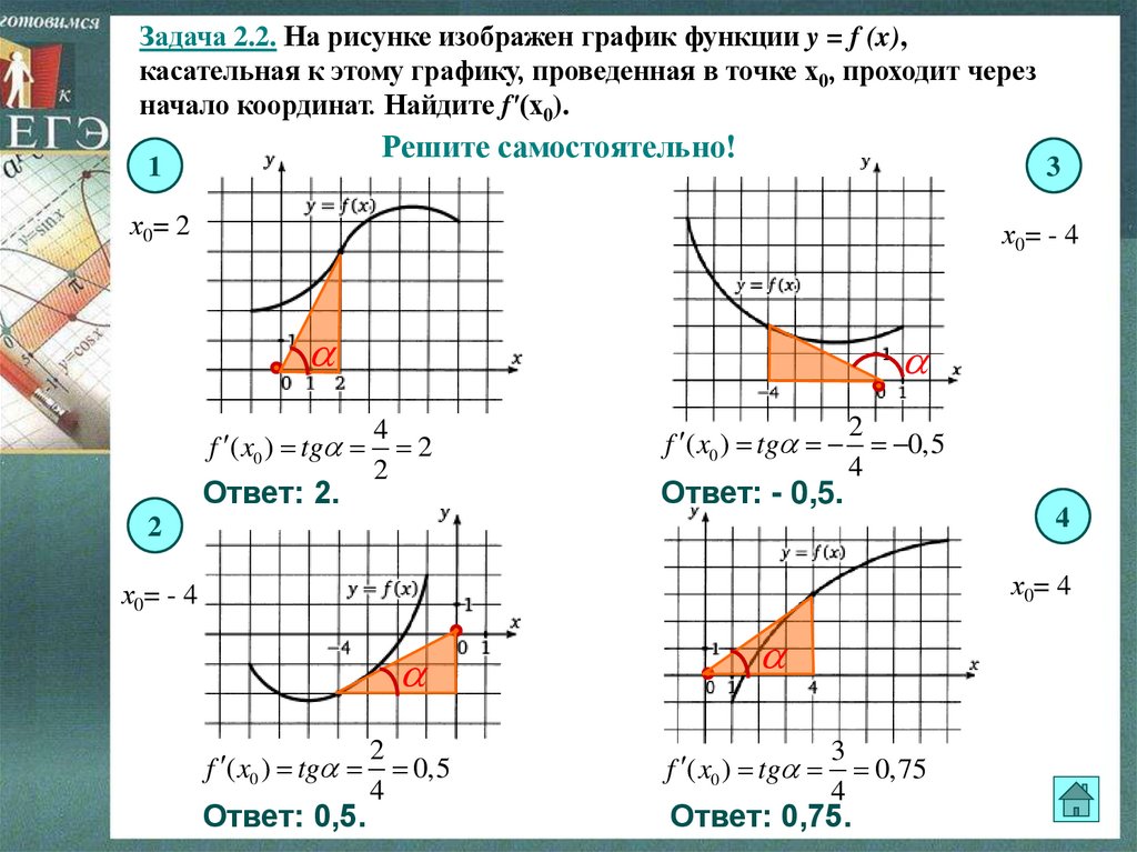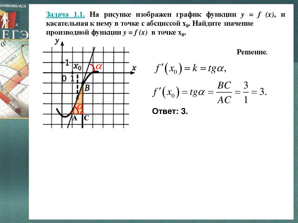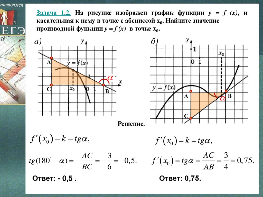 Задача 1.2. На рисунке изображен график функции y = f (x), икасательная к нему в точке с абсциссой х0. Найдите значение