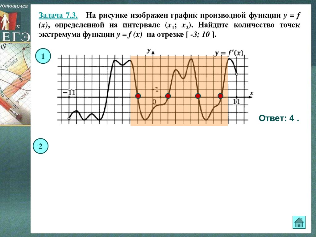 Задача 7.3. На рисунке изображен график производной функции y = f(x), определенной на интервале (x1; x2). Найдите количество точек