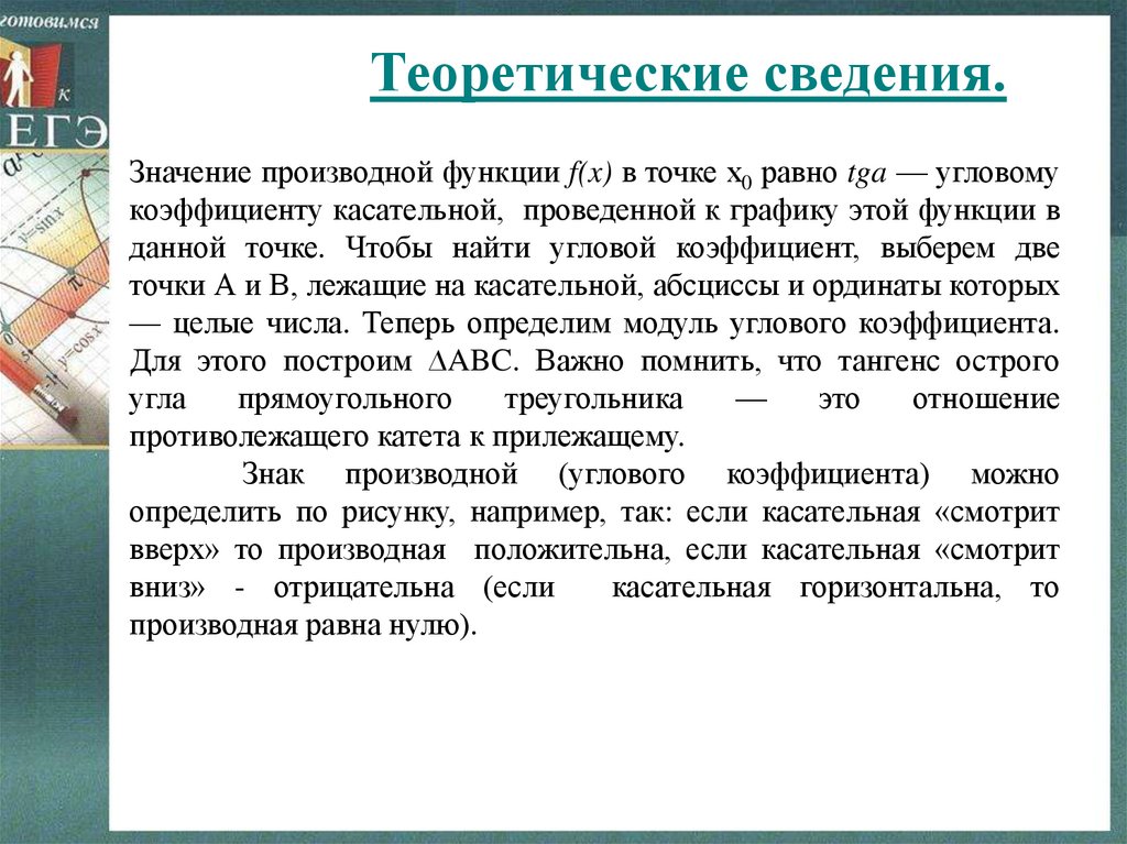 Теоретические сведения.Значение производной функции f(x) в точке х0 равно tga — угловому
