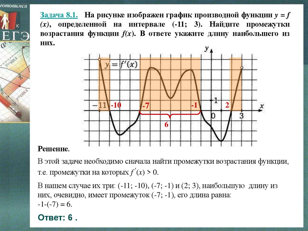 Задача 8.1. На рисунке изображен график производной функции y = f(x), определенной на интервале (-11; 3). Найдите промежутки