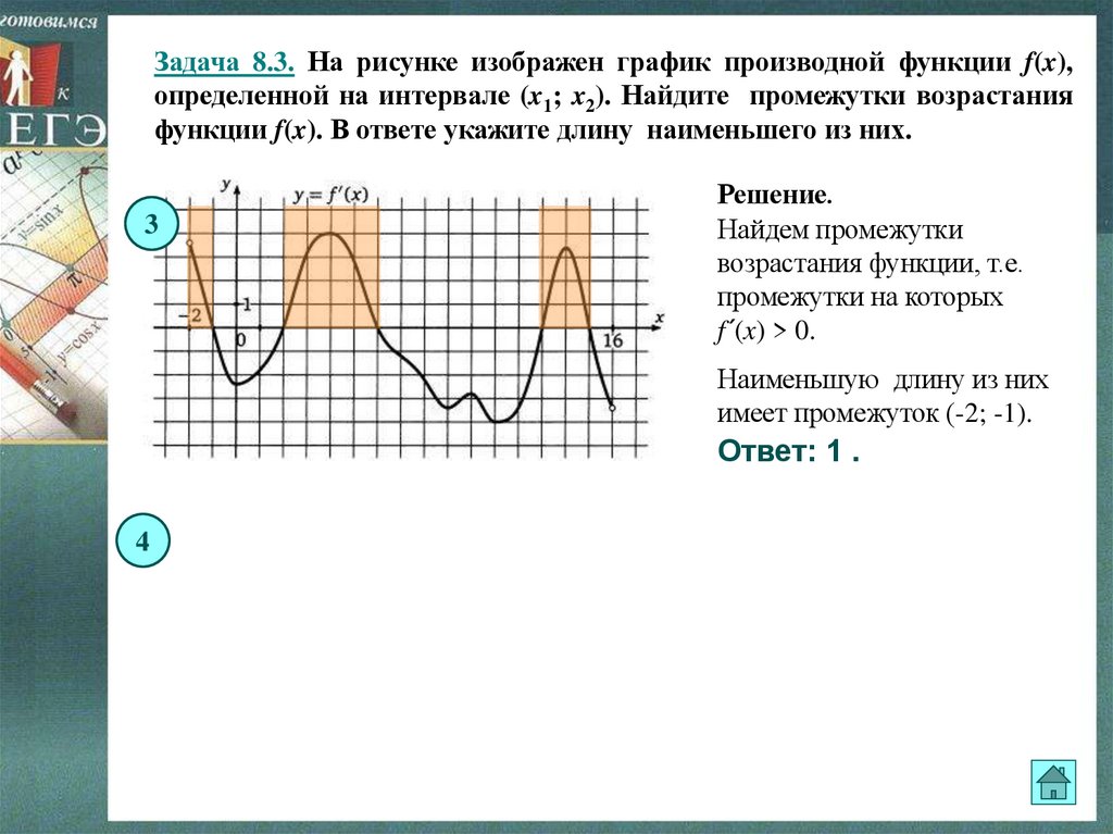 Задача 8.3. На рисунке изображен график производной функции f(x),определенной на интервале (x1; x2). Найдите промежутки возрастания