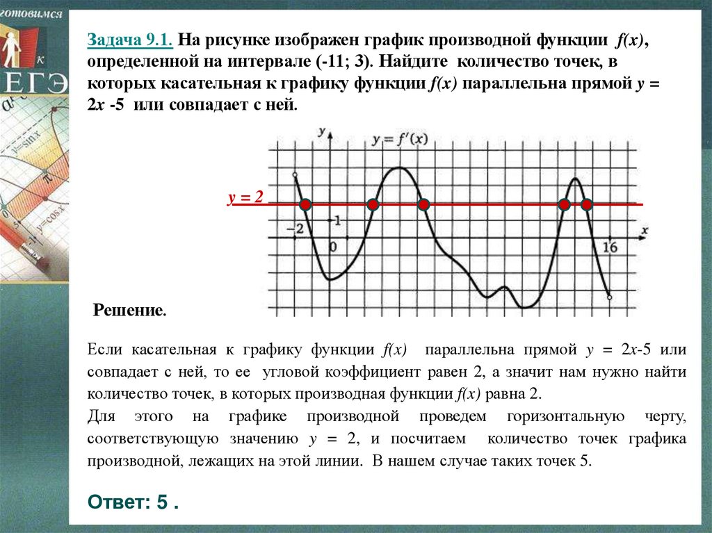 Задача 9.1. На рисунке изображен график производной функции f(x),определенной на интервале (-11; 3). Найдите количество точек, в