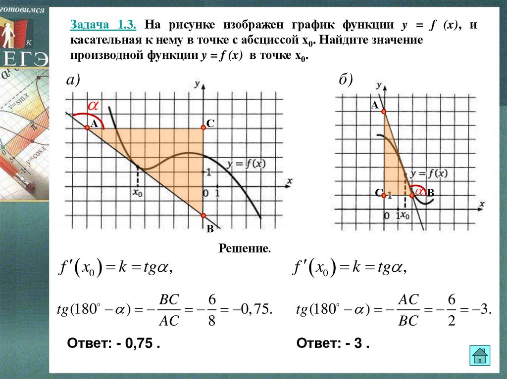 Задача 1.3. На рисунке изображен график функции y = f (x), икасательная к нему в точке с абсциссой х0. Найдите значение