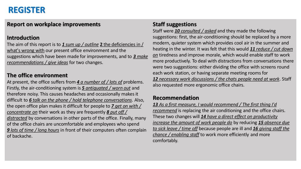 suggestions which have been made for improvements, and to 3 make on tiredness and improve morale, which would enable staff to work