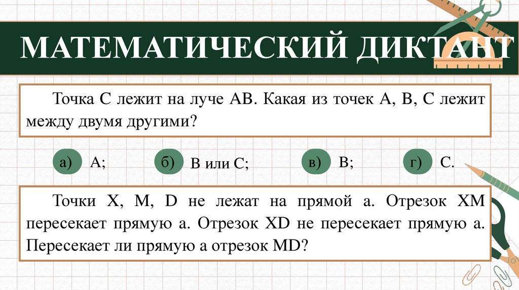 МАТЕМАТИЧЕСКИЙ ДИКТАНТТочка C лежит на луче AB. Какая из точек A, B, C лежит