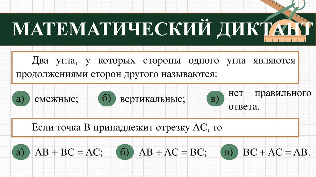 МАТЕМАТИЧЕСКИЙ ДИКТАНТДва угла, у которых стороны одного угла являются
