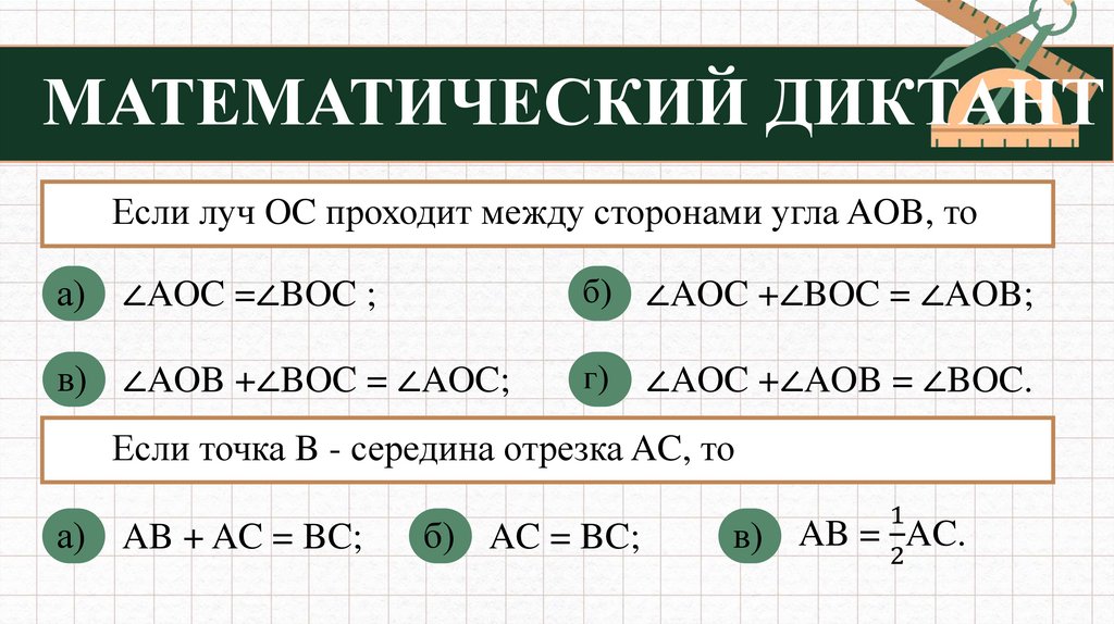 МАТЕМАТИЧЕСКИЙ ДИКТАНТЕсли луч OC проходит между сторонами угла AOB, то