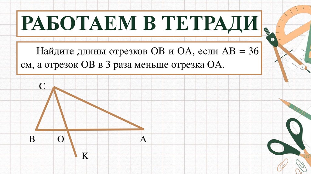 РАБОТАЕМ В ТЕТРАДИНайдите длины отрезков OB и OA, если AB = 36