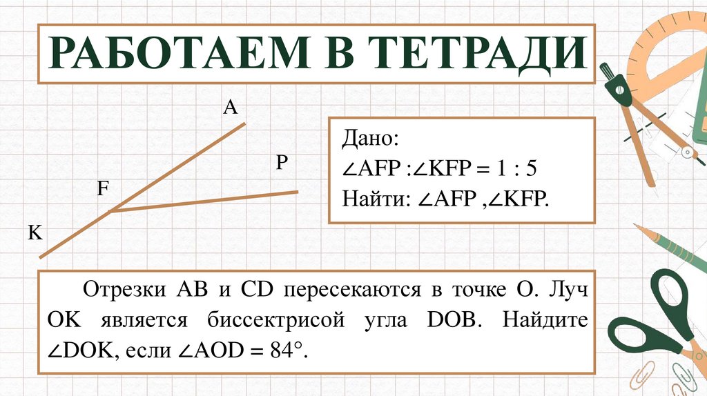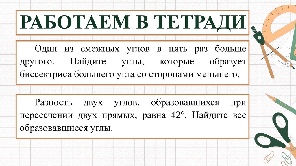 РАБОТАЕМ В ТЕТРАДИОдин из смежных углов в пять раз больше