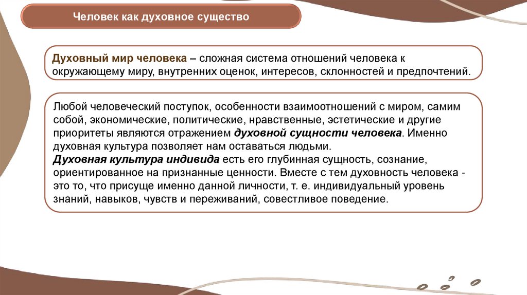 Человек как духовное существоДуховный мир человека – сложная система отношений человека к