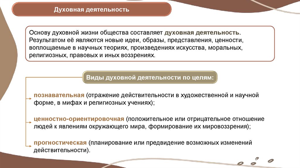 Духовная деятельностьОснову духовной жизни общества составляет духовная деятельность.