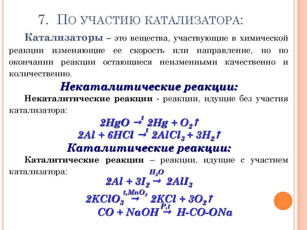 7. ПО УЧАСТИЮ КАТАЛИЗАТОРА:Катализаторы – это вещества, участвующие в химической