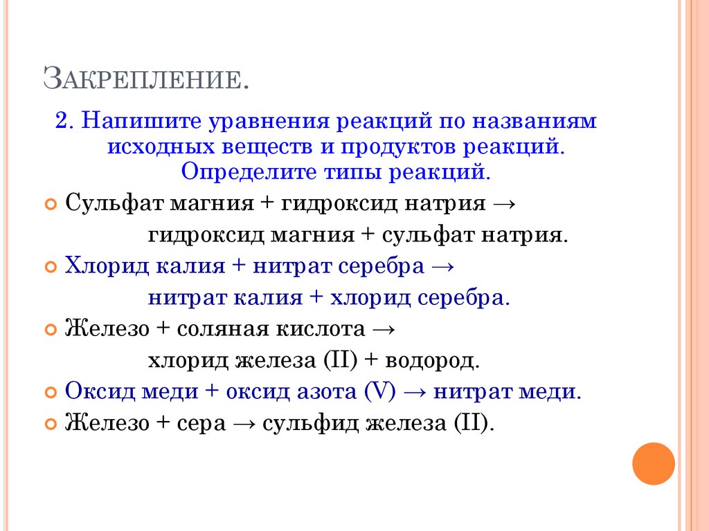 ЗАКРЕПЛЕНИЕ.2. Напишите уравнения реакций по названиям