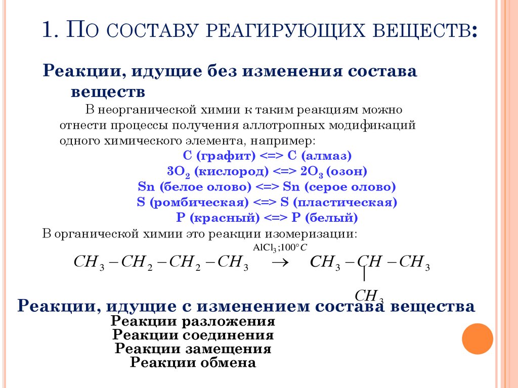 1. ПО СОСТАВУ РЕАГИРУЮЩИХ ВЕЩЕСТВ:Реакции, идущие без изменения состава