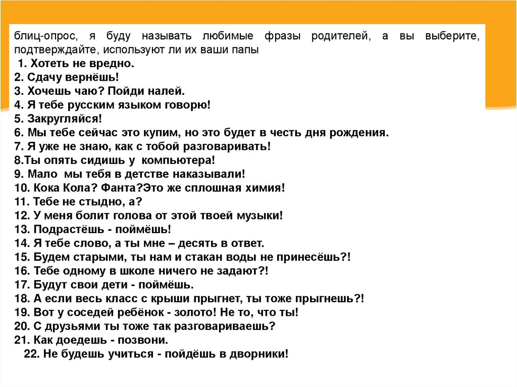 блиц-опрос, я буду называть любимые фразы родителей, а вы выберите,подтверждайте, используют ли их ваши папы