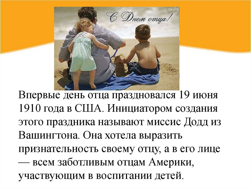 Впервые день отца праздновался 19 июня1910 года в США. Инициатором создания