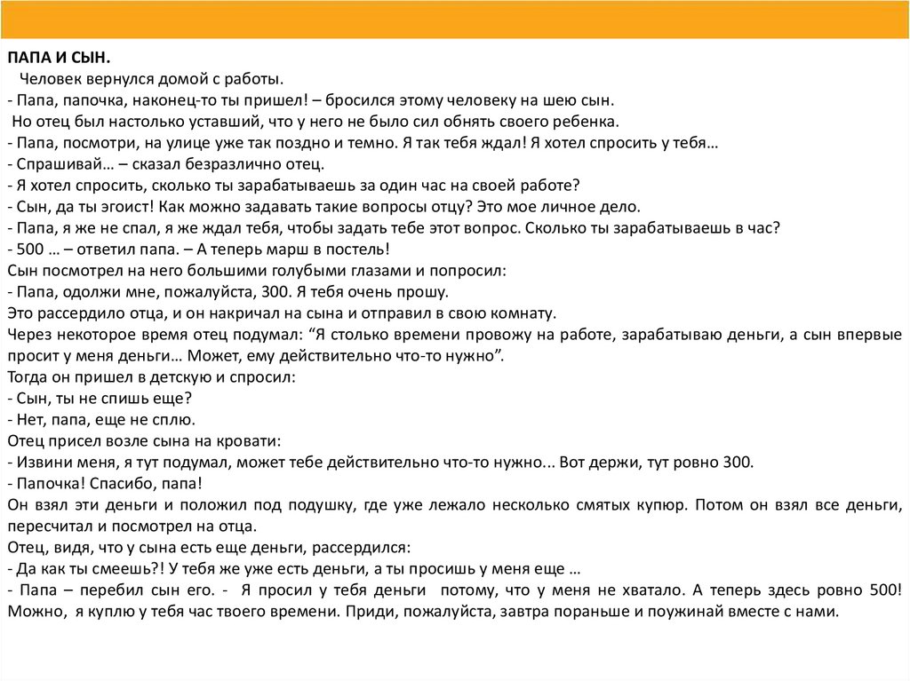 - Папа – перебил сын его. - Я просил у тебя деньги потому, что у меня не хватало. А теперь здесь ровно 500!