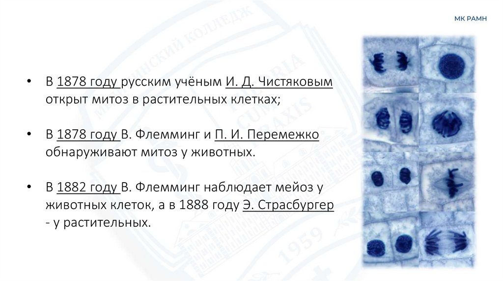 • В 1878 году русским учёным И. Д. Чистяковымоткрыт митоз в растительных клетках;