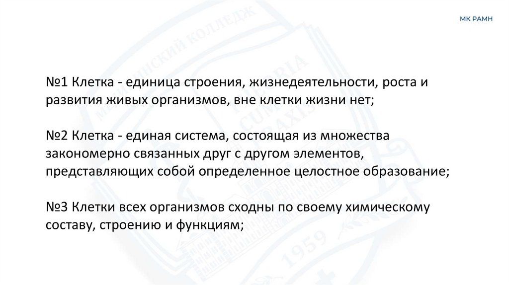 №1 Клетка - единица строения, жизнедеятельности, роста иразвития живых организмов, вне клетки жизни нет;