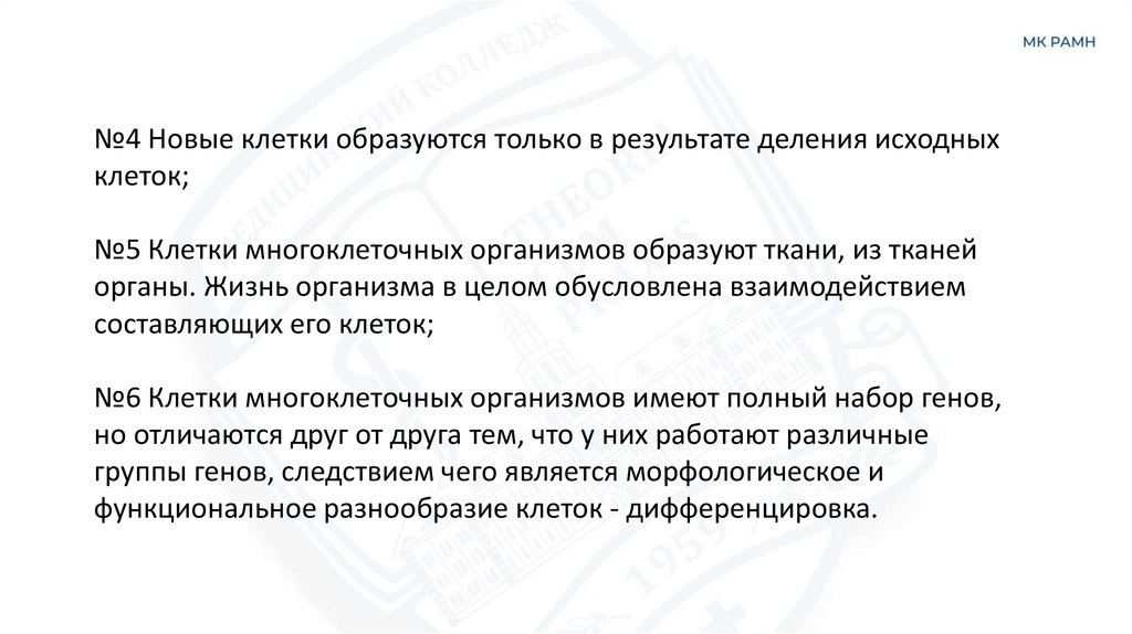 №4 Новые клетки образуются только в результате деления исходныхклеток;