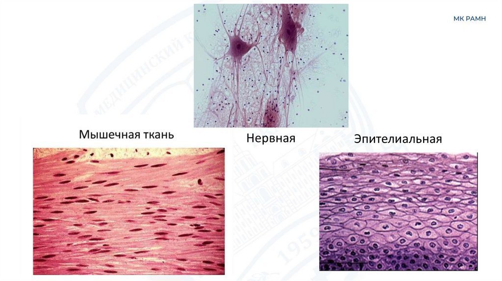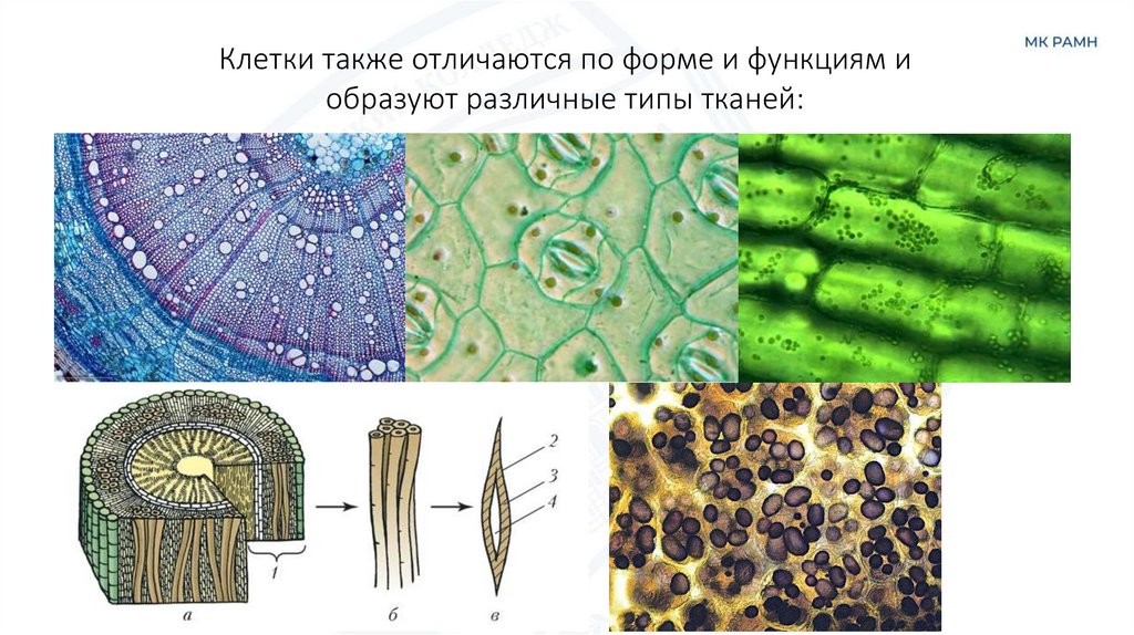 Клетки также отличаются по форме и функциям иобразуют различные типы тканей: