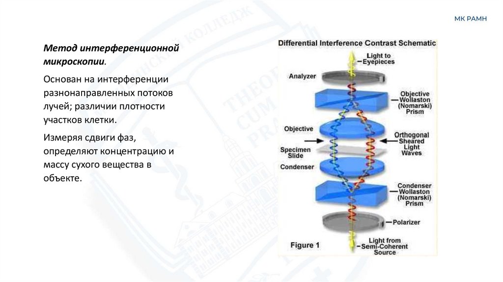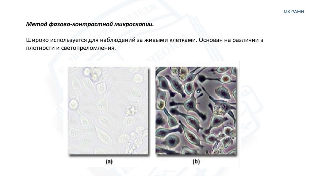 Метод фазово-контрастной микроскопии.Широко используется для наблюдений за живыми клетками. Основан на различии в