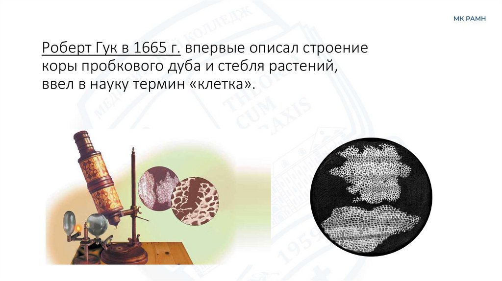 Роберт Гук в 1665 г. впервые описал строениекоры пробкового дуба и стебля растений,