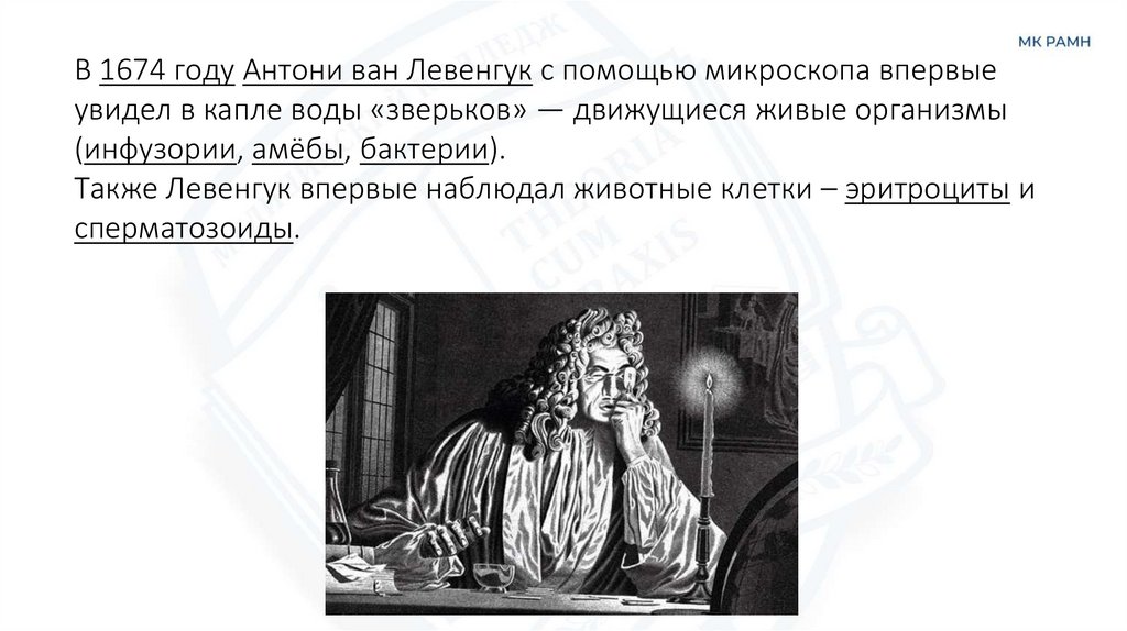 В 1674 году Антони ван Левенгук с помощью микроскопа впервыеувидел в капле воды «зверьков» — движущиеся живые организмы