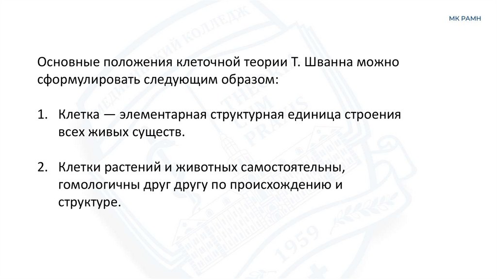 Основные положения клеточной теории Т. Шванна можносформулировать следующим образом: